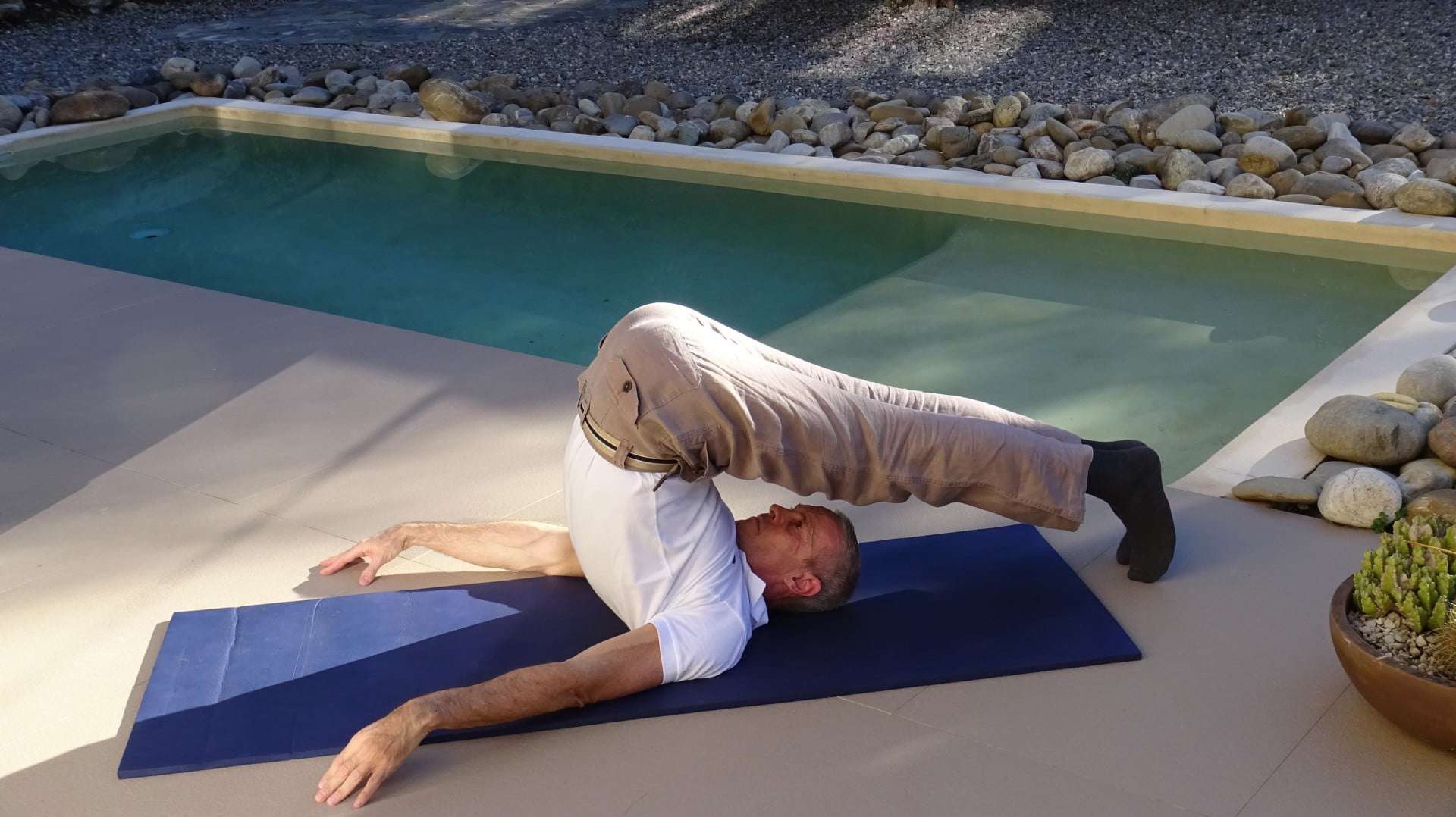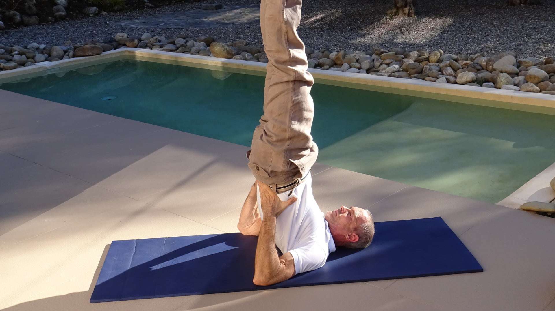 Exhale while trying to touch the floor with your feet or if this is not possible by just trying to drop your legs a little further behind your head for about one to two minutes..