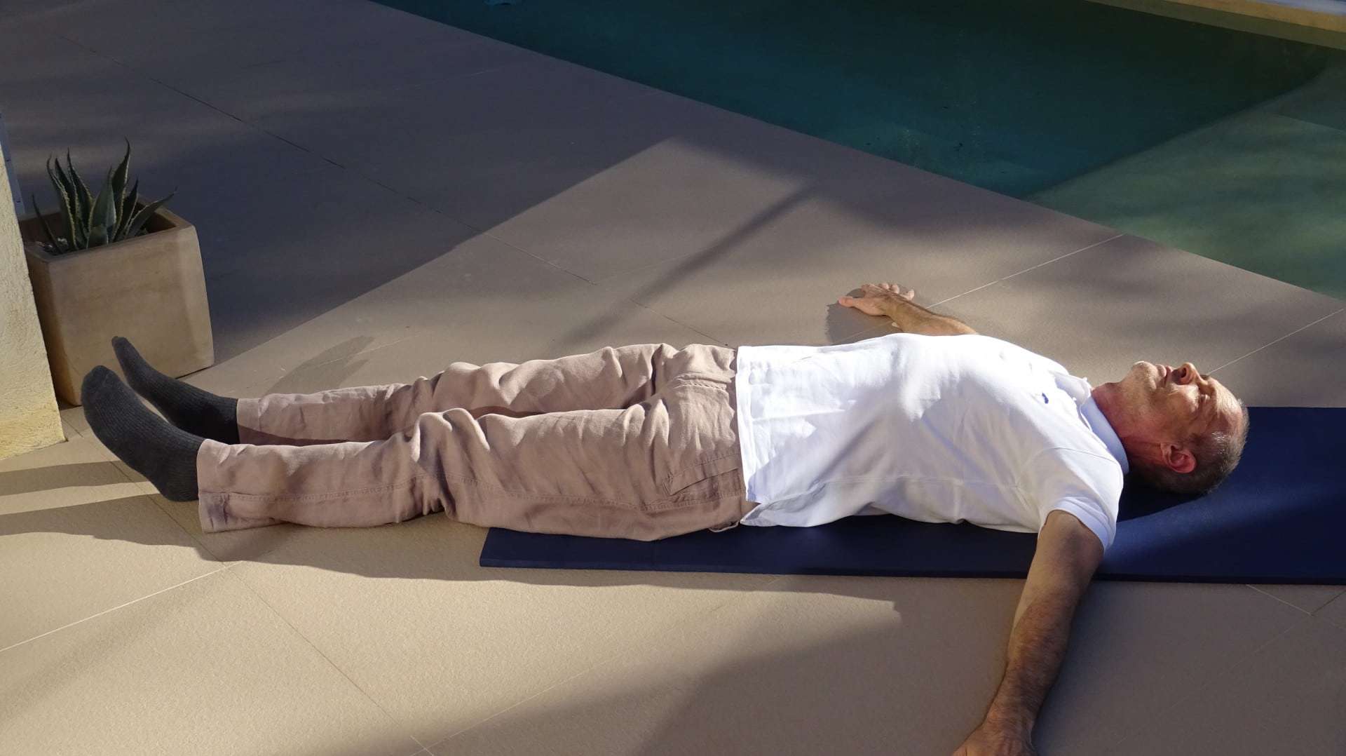 Lying on your back, legs joined on the floor, hands flat.